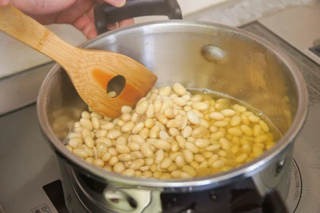 大豆を煮る時は鍋か圧力鍋で煮上げていきます。大豆を鍋に移した後、大豆の表面から約5cmほどの高さまで水を入れます。水が少ないと焦げてしまうので、注意しましょう。煮上がり時間は圧力鍋で約20分、通常の鍋で約6時間が目安です。